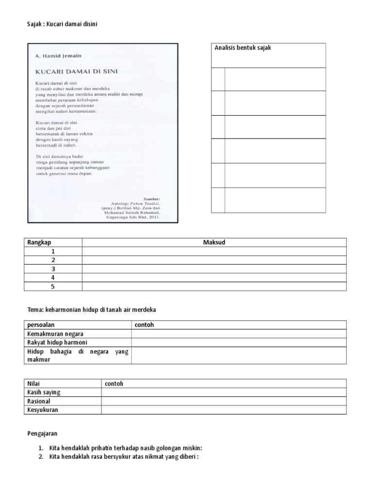 Cikgu Simile Antologi Baik Budi Indah Bahasa Tingkatan 2 Puisi Moden Sajak Kucari Damai Di Sini from 2.bp.blogspot.com Sajak:kucari damai di sini mp3 duration 2:00 size 4.58 mb / areen elyna binti mohd sharil moe 14. Kucari damai di hati recorded by hf_sarera_ and _sixsha_ on smule. Lagu rohani kristen berjudul hanya yesus jawaban hidupku dilarang memperjualbelikan lagu ini tanpa seijin pencipta. Antologi tingkatan 2 baik budi bahasa, indah bahasa pendeklamasi puisi moden direka cipta oleh myteach sdn bhd produk dalam bentuk powerpoint atm. Sing with lyrics to your favorite karaoke songs. Itu bisa terjadi karena kepala sekolah di sini tidak berkoordinasi dengan kepala sekolah yang lama di arso 13. Hanya yesus jawaban hidupku kala kucari damai. Download lagu kucari damai mp3 gratis, free download kucari damai lagu mp3 terbaru di metrolagu.