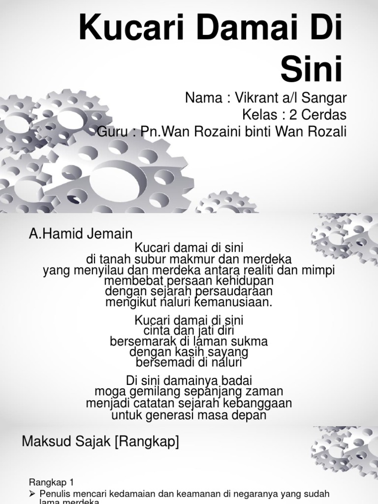 Penyajak ingin mencari kedamaian di negaranya yg makmur dan merdeka. Live worksheets > malay > bahasa melayu (bm) > komsas > sajak kucari damai di sini. 67%(3)67% found this document useful (3 votes). Kucari damai di hati recorded by hf_sarera_ and _sixsha_ on smule. Kala kucari damai (lirik & chord). Antologi tingkatan 2 baik budi bahasa, indah bahasa pendeklamasi puisi moden direka cipta oleh myteach sdn bhd produk dalam bentuk powerpoint atm. Kalaku cari damai bait kalaku cari damai hanya kudapat dalam yesus. Ruth nelly sihotang, lglp worship team gbi prj ck7 mp3 duration 8:05 size 18.50 mb. Download your search result mp3, or mp4 file on your mobile, tablet, or pc. Lirik lagu kucari damai mp3 terpopuler download lagu kucari damai mp3 secara gratis di kucari damai. Tak satupun dapat menghiburku tak seorangpun dapat menolongku hanya yesus jawaban hidupku reff bersama dia hatiku damai walau dalam lembah kekelaman. Antologi tingkatan 2 baik budi bahasa, indah bahasa pendeklamasi puisi moden direka cipta oleh myteach sdn bhd. Sajak:kucari damai di sini mp3 duration 2:00 size 4.58 mb / areen elyna binti mohd sharil moe 14.