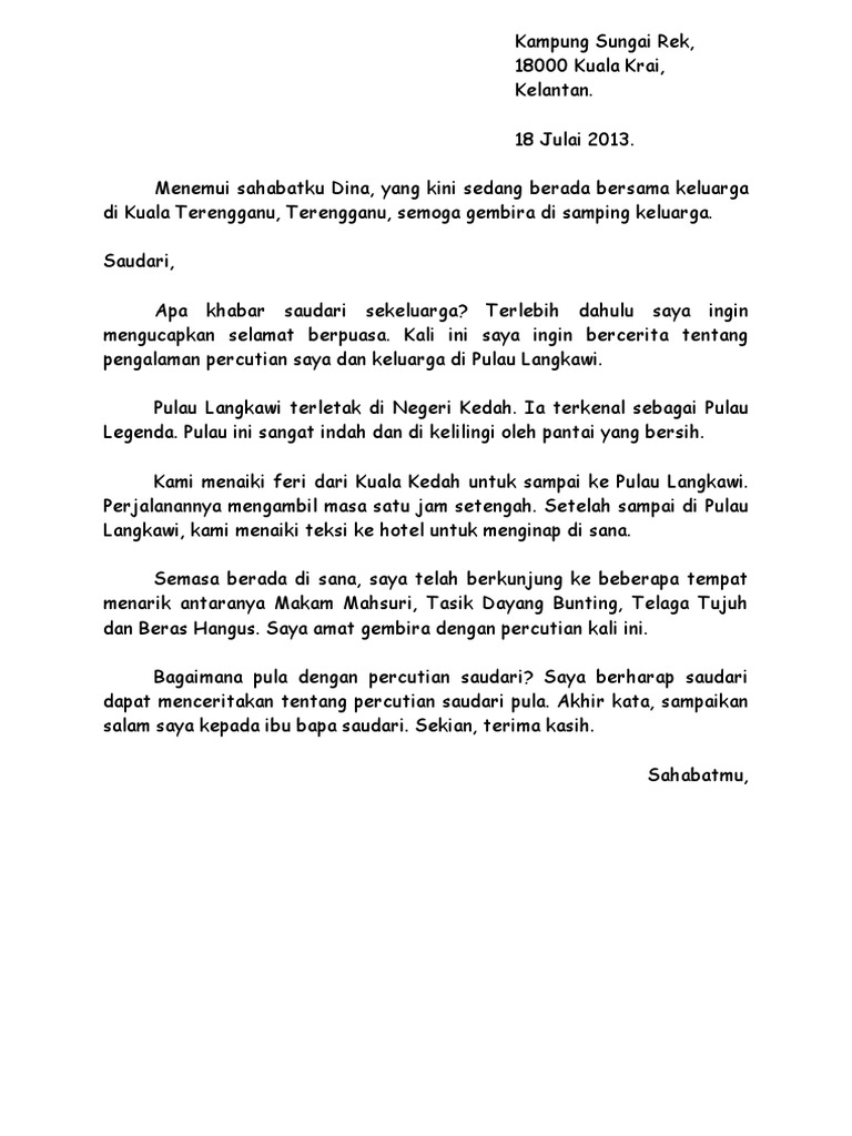 A) alamat pengirim — ditulis di sebelah kanan bahagian atas surat b) tarikh ditulis di bawah alamat fiza : (pada sebelah kiri, alamat, tarikh dan tandatangan hendaklah ditulis). Tujuan surat ditulis dinyatakan secara halus dan tidak langsung. Surat kiriman rasmi tidak sama dengan surat kiriman tidak rasmi. 2) situasi ini adalah sebagai panduan untuk memudahkan anda menentukan penerima surat. Jawatan kosong cara atau format menulsi surat kiriman tidak rasmi terbaik dan simple. Surat kiriman rasmi adalah surat bertajuk yang singkat dan padat tanpa ayat panjang dan bahasa kiasan. Panduan mengarang surat kiriman tidak rasmi. Jika membalas surat, sebelum menanyakan sesuatu , terlebih dahulu jawab pertanyaan yang dikemukakan sebelum ini. Jenis surat kiriman tidak rasmi: Andaikan bahawa rakan anda telah berjaya menjadi juara dalam suatu pertandingan, tulis sepucuk surat kepada rakan anda itu untuk mengucapkan tahniah kepadanya. Jika soalan ingin kamu memujuk, surat yang kamu tulis haruslah penuh dengan pujukan dan pelbagai sebab. Surat kiriman tidak rasmi adalah bersifat peribadi dan pada kebiasaannya dituliskan kepada ibu bapa.